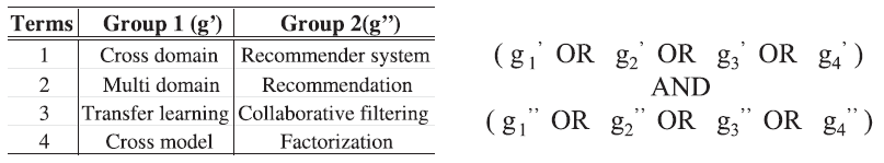 另外,根据相似性将短语进行分组。因此组1的短语和多种实体之间存在的关系有关。组2和研究领域有关。搜索关键词由此被构建出,如表5所示。