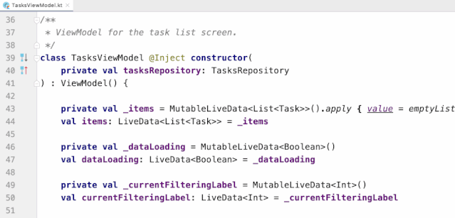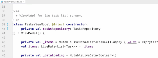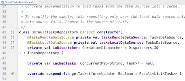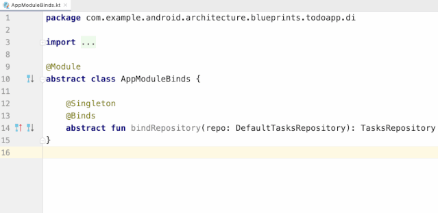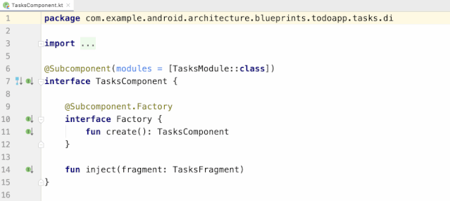 最新的 Android Studio 4.1 版本 (目前在 Canary 预览版发布渠道可以下载) 为我们带来了一个新的 "间距图标" (在编辑器和代码行号之间的图标,如下图所示),通过点击这个图标,我们可以轻松地在 Dagger 的关联代码间进行导航,包括依赖项的生产者、消费者、组件、子组件以及模块。您同样可以在 Find usages 中获取相同的信息。