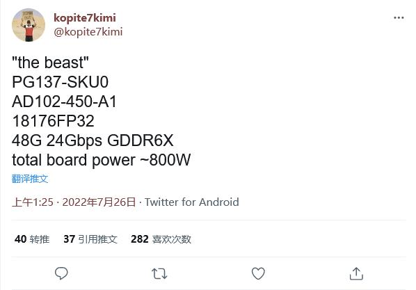 近期,英伟达开启了 30 系显卡的促销活动,购买相应的显卡或者搭载显卡的笔记本电脑,便可以获赠部分游戏。有消息称,英伟达相关的促销活动可能是为了清理 RTX 30 系显卡的库存,为接下来 RTX 40 系显卡的发布做准备。而近日有爆料者在推特发文表示,英伟达将基于 AD102-450 核心,打造一款编号为 PG137 的新显卡,它不同于 RTX 4090 所用的 PG139 编号,因此肯定将会是一款新显卡。