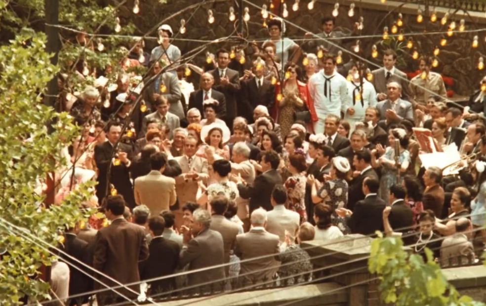 接下来,画面一下切换到房间外面,原来是一派热闹的婚礼场景。故事的设定上,老教父为小女儿康妮举办了一场隆重的意大利式的婚礼。因此在婚礼的画面里,科波拉也加入了大量的细节。比如在意大利文化中,从来不会把孩子单独扔在家里,所以哪怕是出席有头有脸的大人物的婚礼,大家也会拖家带口,甚至带上闹哄哄的婴儿。另外,在婚礼上,接过旁人随手扔出的三明治,则来自科波拉自己童年时代的婚礼记忆,他把这个回忆中的画面也放到了《教父》的剧本里。