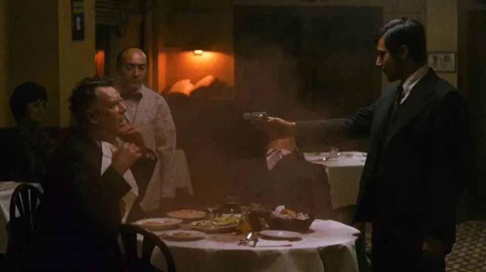 因此,在科波拉整理剧本的过程中,他会试着用一两个核心词、一句话总结每个场景试图去表达什么。比如,我们一想到迈克尔在小餐馆里射杀警长和索罗佐的画面,就会想到这是一幅「复仇」的场景,这和影片结束前,迈克尔操控血洗五大家族的杀戮场景遥相呼应。