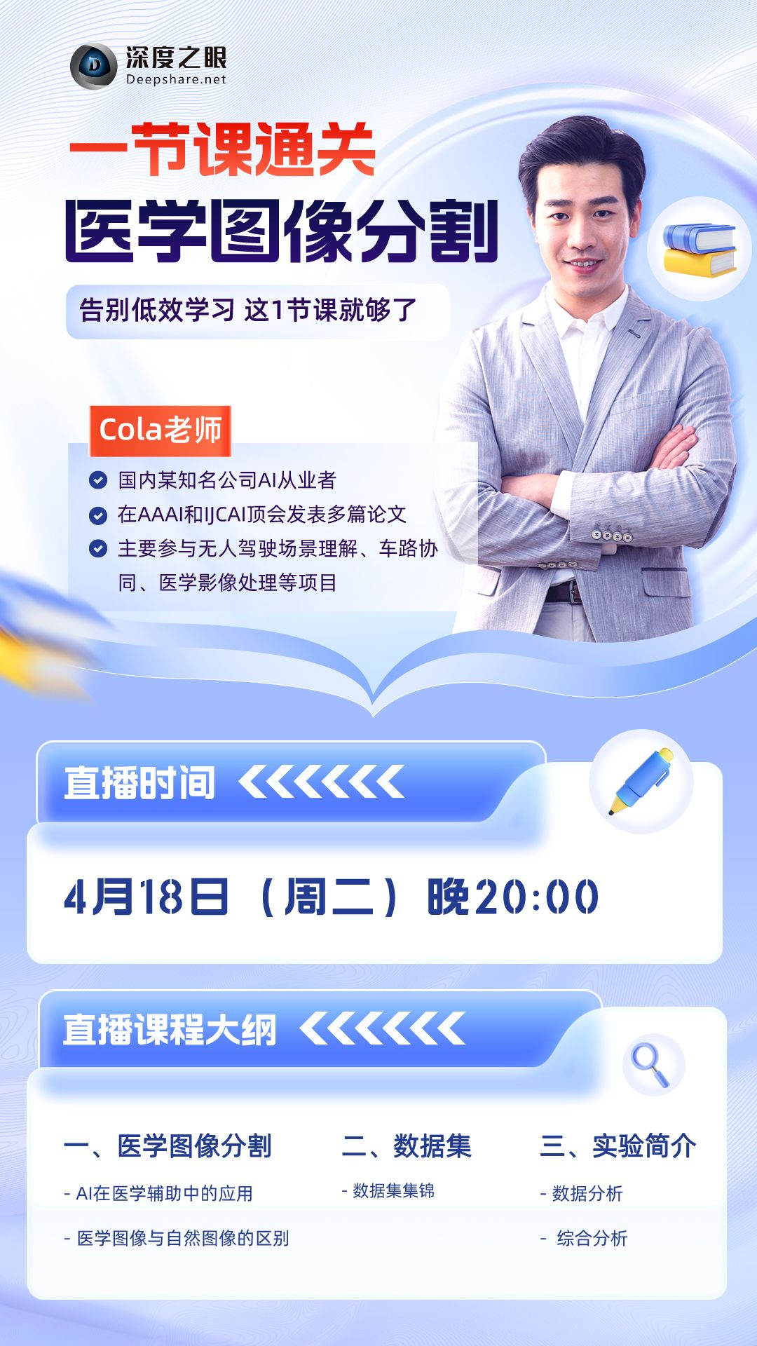 4月18晚20:00,我们特地准备了由深耕“医学图像分割”多年的Cola老师为我们带来《一节课通关医学图像分割》,内容非常干货!