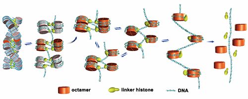 图1. 染色质纤维动态折叠路径,四聚核小体单元是折叠路径中稳定的中间态。