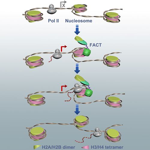 图2. FACT 对染色质纤维的负调控。FACT 的结合让染色质纤维非常容易打开到核小体链的状态,便于转录机器 PolII 的结合,为基因转录做好准备。