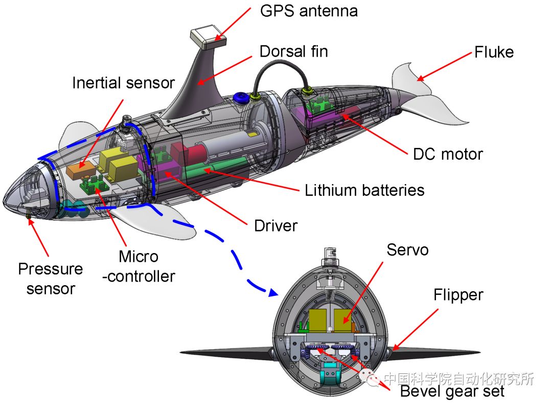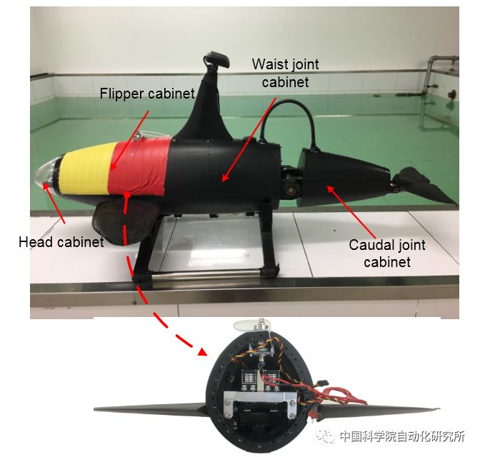 图1 仿生机器海豚平台 (上图); 机械设计图样机(下图)