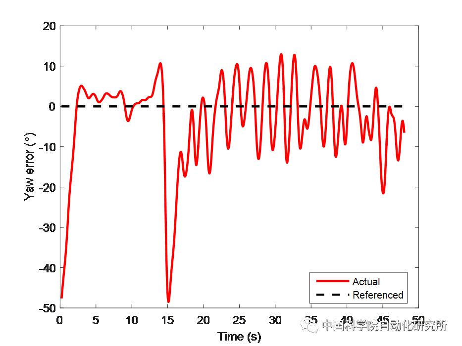 在室内进行路径跟踪策略的验证实验,其中室内全局摄像头实时提供机器海豚的位置信息,路径跟踪实验结果如图3所示,在整个实验过程中,其航向角跟踪与横向跟踪误差如图4所示。