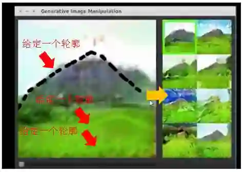 这是一个有趣的应用,如图2所示,根据人所绘的大致轮廓(图左),由GAN绘制对应图像。有感兴趣的,可以翻墙的小伙伴可以自行前去YouTube上观看,以便获得更好的展示效果,传送门: