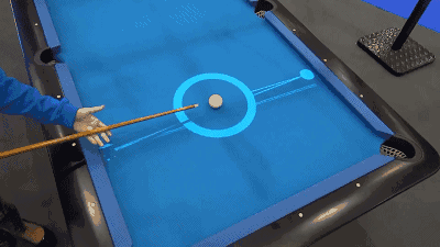 PoolLiveAid就是将这个辅助线带到了现实当中。通过在台球桌上的摄像头可以捕捉球与杆的位置,然后通过系统运算算出运动轨迹,最后用激光投影再投射到桌面上去。