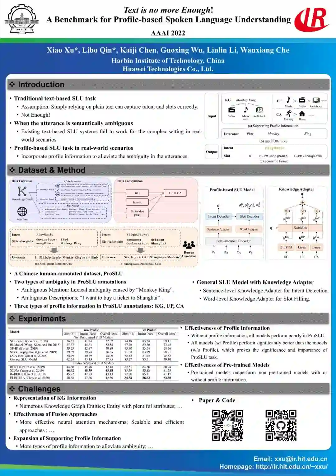 口语语言理解(SLU)的研究目前主要局限于简单的设置,也即基于纯文本的SLU系统,将用户话语作为输入并生成其相应的语义信息(如意图和槽位)。但这样的系统可能无法在复杂的现实世界场景中发挥作用,当语义存在歧义时,仅基于纯文本的SLU系统就无法产生正确的语义信息。本文首先介绍了一个重要的新任务——基于Profile的口语语言理解(ProSLU),它要求模型不仅要依赖纯文本,而且要充分利用辅助的特征信息来预测正确的意图和槽位。为此,我们人工标注一个大规模的中文数据集,其中有约五千条的用户话语及其对应的Profile信息(知识图谱(KG),用户配置(UP),环境感知(CA))。此外,我们评估了几个最先进的基线模型,并探索了一个多层次的知识适配器,以有效地利用Profile信息。实验结果显示,现有的基于纯文本的SLU模型在语义存在歧义的情况下都效果不佳,而我们提出的多层次的知识适配器可以有效地融合Profile信息,从而在句子级的意图检测和标记级的槽位填充任务中更好的利用Profile信息。最后,我们总结了关键的挑战,并为未来的发展方向提供了新的观点,希望能促进这方面的研究。