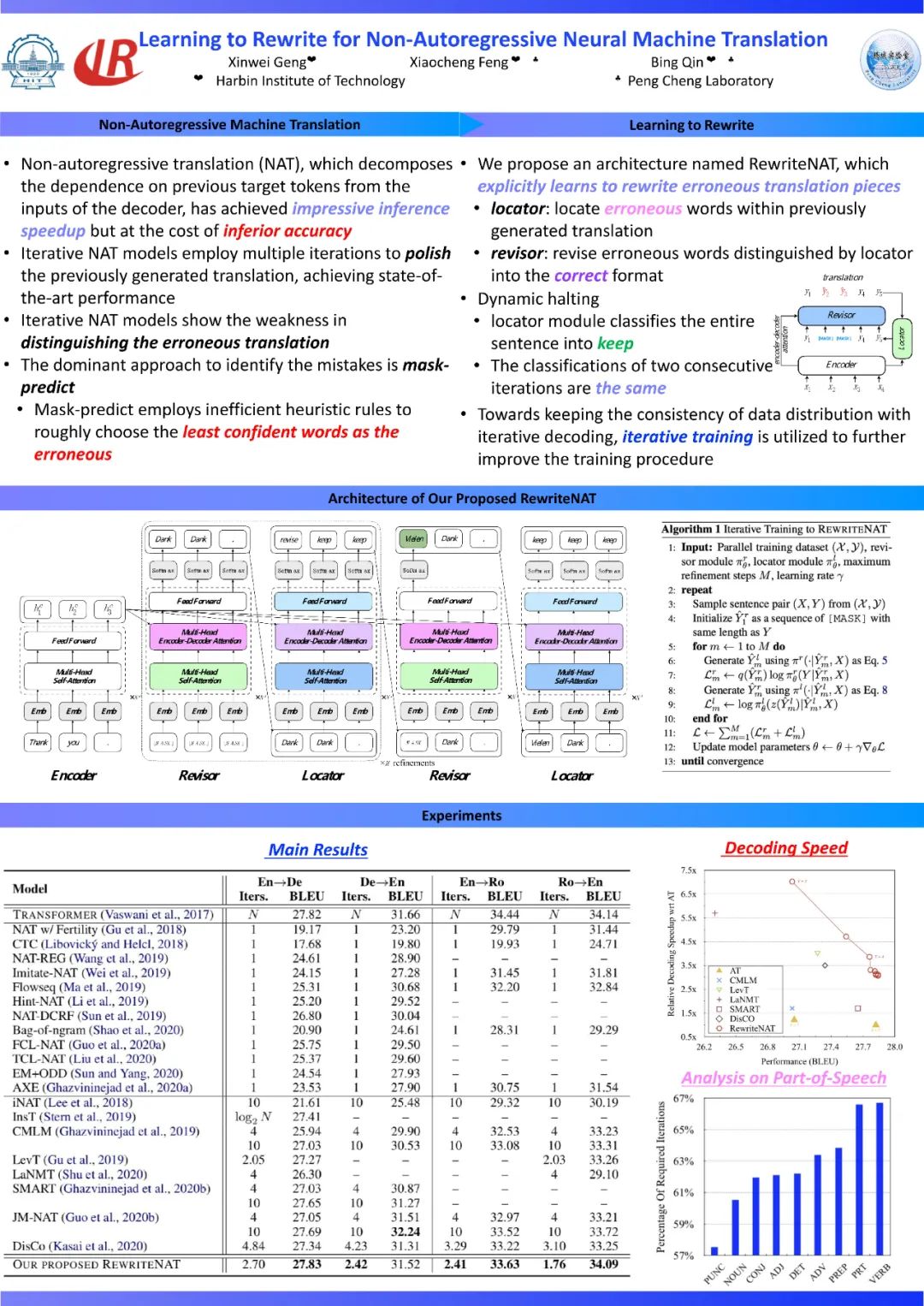 非自回归机器翻译由于其解码过程不依赖于之前翻译结果从而获得很高的推理速度,但是其翻译质量相对较差。近期许多工作将迭代式的解码策略引入非自回归机器翻译中,其通过多次优化先前的翻译结果从而提升最终翻译质量。但是,其中一个显著问题是在迭代式解码过程中这些方法并不能显示区分翻译结果中的错误。在本工作中,我们提出一个新的非自回归机器翻译架构,其可以学习改写翻译结果的错误内容。该架构使用一个定位模块识别翻译中的错误,而后使用另一个改写模块将其改写成正确翻译内容。此外,为了保证训练和迭代式解码过程中输入数据分布的一致性,我们采用迭代式的训练方法进一步提升模型的改写错误能力。在多个广泛使用的翻译数据上的实验结果显示,相比多个传统的迭代式非自回归方法,我们提出方法可以获得更好的翻译性能,同时显著的减少解码时间。