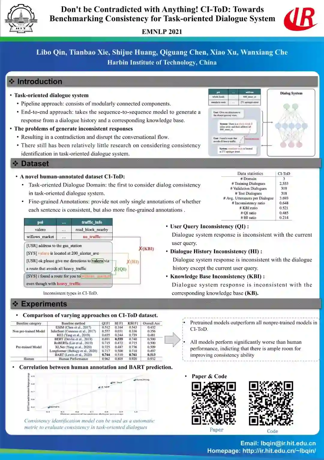 我们认为生成回复的一致性特性在神经网络为黑盒的对话模型中非常重要, 相比于开放域对话系统的一致性研究,任务型对话系统更为重要,因为它影响最终的用户实际体验。我们贡献了一个数据集,希望促进这块的研究,相比于大部分的开放域对话一致性工作,它有如下几个特点:(1) 考虑真实多轮对话,相比之前单轮一致性更真实(2) 考虑任务型对话系统特定的数据库是否一致的问题(3) 三种细粒度标注,帮助模型诊断当前回复是否与对话历史不一致,用户query不一致,还是对应的知识库不一致。所有数据集,相关baseline代码开源在