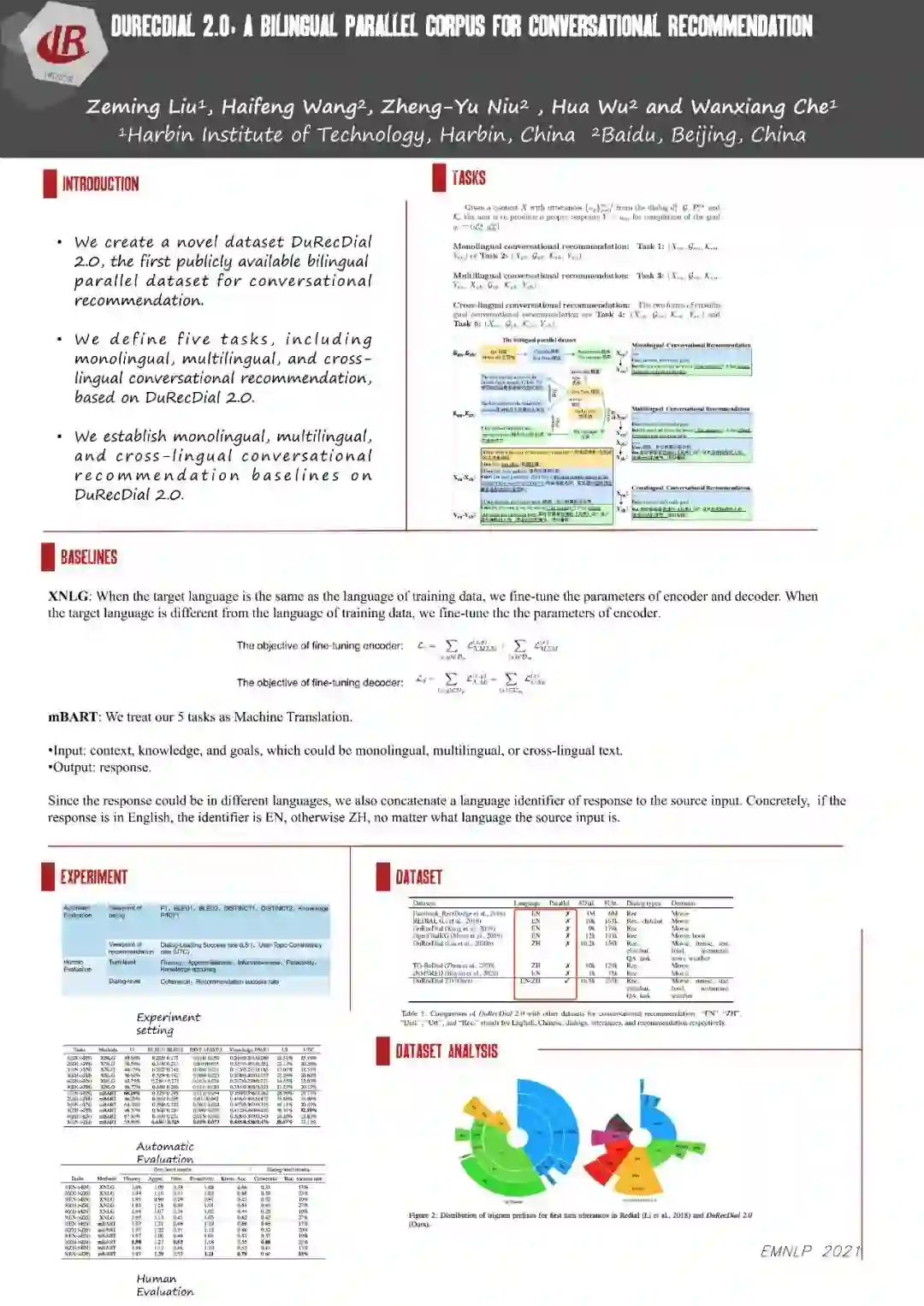 在本文中,我们构建了首个中英双语平行的包含多种对话类型、多领域和丰富对话逻辑(考虑用户实时反馈)的human-to-human对话推荐数据集DuRecDial 2.0,使研究人员能够同时探索单语言、多语言和跨语言对话推荐的性能差异。DuRecDial 2.0与现有对话推荐数据集的区别在于,DuRecDial 2.0中的数据项(用户Profile、对话目标、对话所需知识、对话场景、对话上下文、回复)都是中英平行的,而其他数据集都是单语设定。DuRecDial 2.0包含8.2k个中英文对齐的对话(总共16.5k个对话和255k个utterance),这些对话都是通过严格的质量控制流程,由众包人员标注而成。然后,我们基于DuRecDial 2.0,设定了5个任务(包含单语言、多语言和跨语言对话推荐),并基于mBART和XNLG构建单语、多语和跨语言对话推荐基线,支持未来研究。实验结果表明,使用英语对话推荐数据可以提高中文对话推荐的性能。