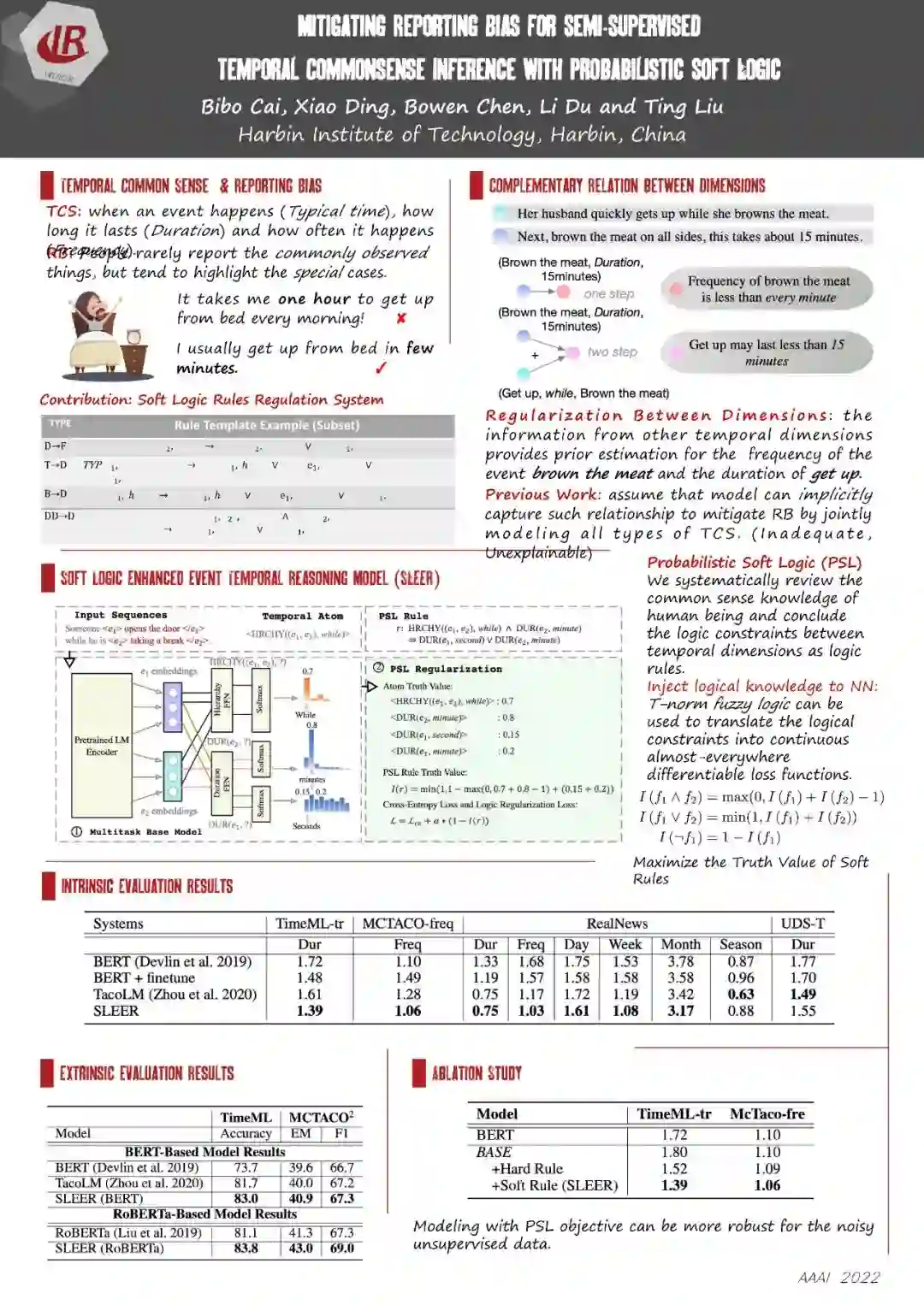对以事件为核心的自然语言理解任务而言,使得模型掌握一定的时间相关的常识知识十分重要。但是由于“报告偏差”(Reporting Bias,即人们在日常交谈、书写时往往不会提及常见的情况而对不常见情况加以强调)问题的存在,从大规模文本中以无监督的方式抽取到时间常识知识往往是有偏的,基于这些有偏数据以简单方法训练得到的模型也往往不能达到理想的性能。为此,前人的工作中提出通过引入不同维度(如典型发生时间,持续时间,发生频率)的时间常识之间的互补关系来解决报告偏差的问题。本文认为,前人的隐式的建模互补关系的方式是数据驱动的,存在建模不充分且不可解释的问题。本文则是详细总结了不同维度时间常识的知识的互补关系,将之表示为一阶逻辑,然后以端到端的方式,使用逻辑约束损失显式优化对不同时间维度的表示,使得模型预测结果能够与逻辑知识一致。在intrinsic和extrinsic数据上的实验上均展现了我们的方法相较于前人工作的优越性。