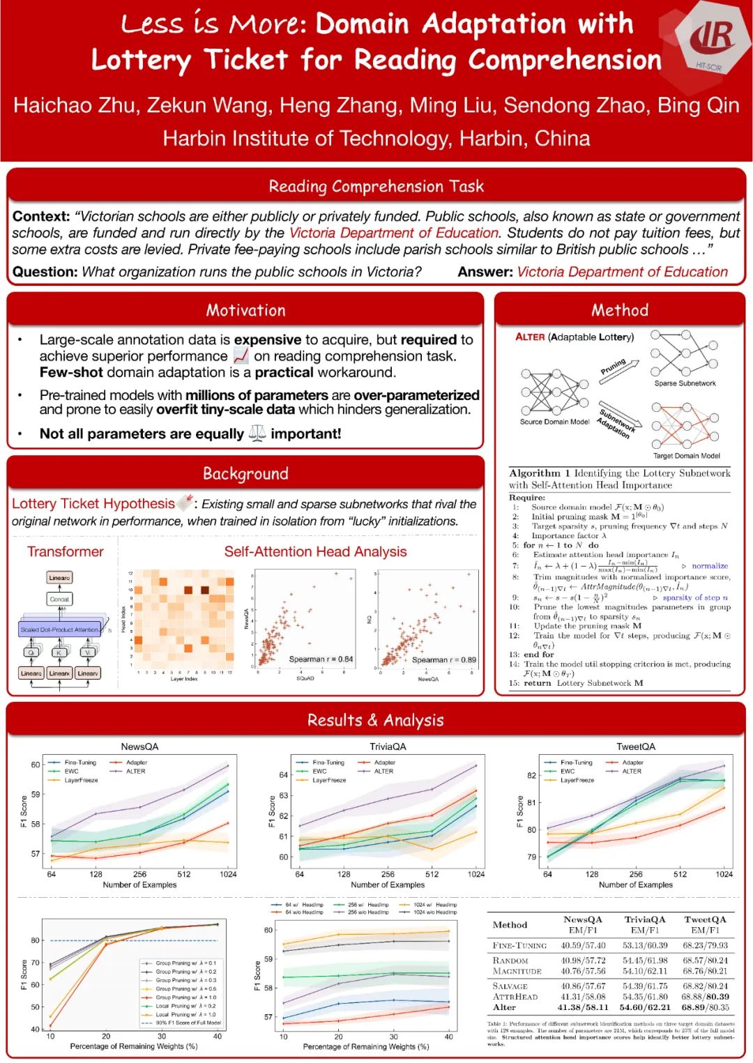 在本文中,我们提出了一种用于阅读理解的简单的小样本域适应方法。我们首先识别出基于 Transformer 的源域模型中的子网络。然后,使用目标领域上的标注数据来更新子网络的参数(占整个模型参数的一小部分)来进行领域迁移。为了获得更具迁移性的子网络,我们引入了自注意力归因来帮助识别子网络,通过这种方法,我们同时考量参数的结构化与非结构化重要性。实验结果表明,进行少样本领域迁移时,我们的方法在四个目标领域上优于微调全部参数及三个基线方法。此外,引入自注意力归因后,子网络包含了更多的来自重要的自注意力头(Self-Attention Head)的参数,提高了领域迁移的性能。进一步分析表明,除了利用较少的参数进行领域迁移外,子网络的选择对有效性有非常重要的影响。