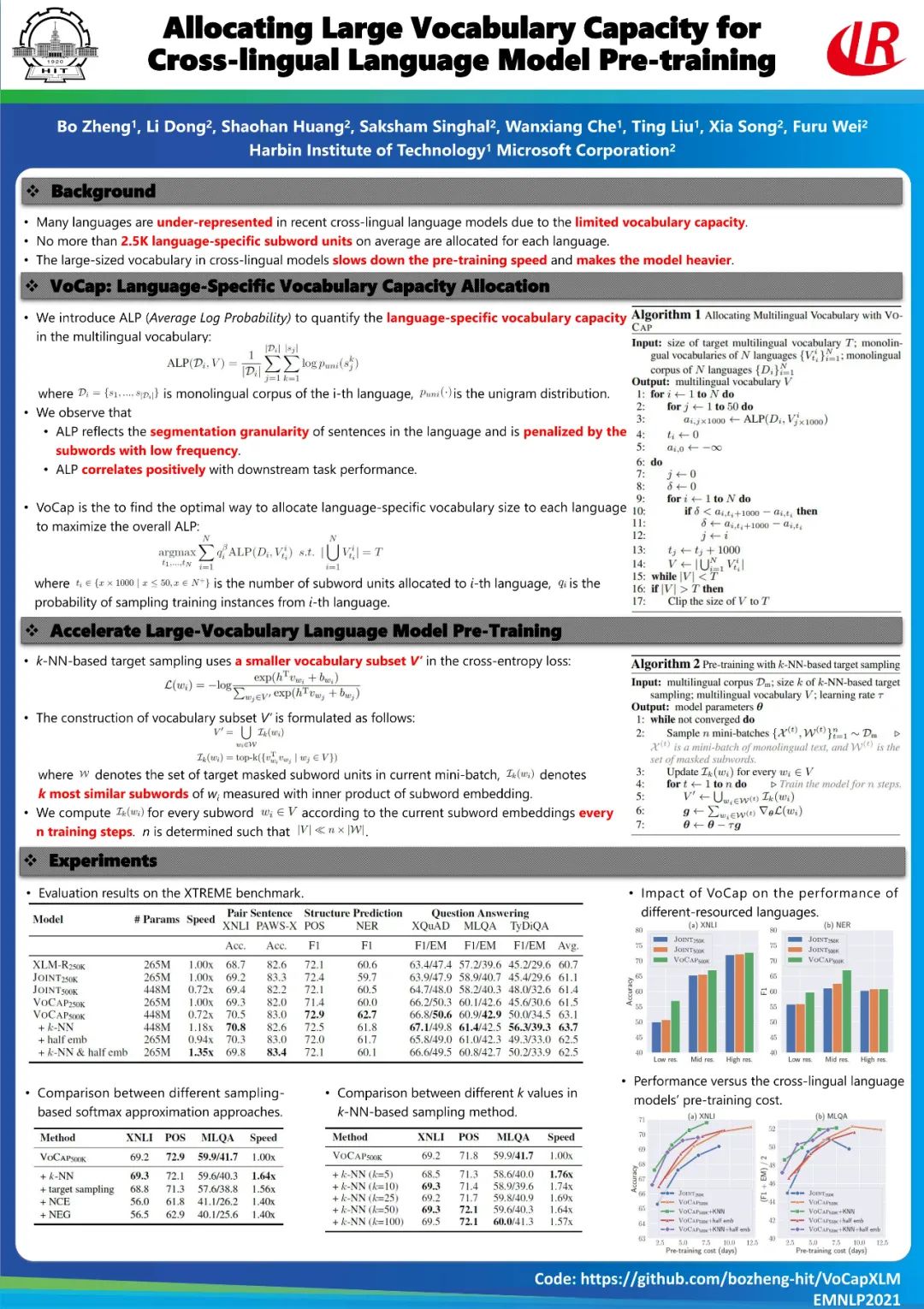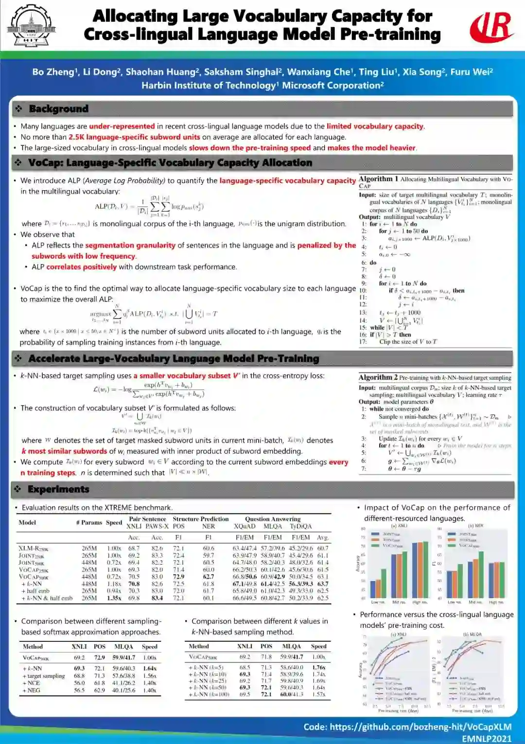 与单语模型相比,跨语言模型需要更大的词表来充分表示所有语言。在近期的跨语言模型中,许多语言没有被分配足够的词汇量,导致这些语言不能被很好的表示。为此,我们提出了VoCap,该方法通过分别评估每种语言所需的词汇量来生成更大的多语言词表。然而,增加词汇量会减慢预训练速度,并使模型参数量更大。为了解决这些问题,我们首先提出了基于 k-NN 的目标采样(k-NN-based Target Sampling),通过估计Softmax 来加速大词表模型的预训练。同时我们减少输入和输出词向量维度以保持模型参数量不变。我们在XTREME上进行了实验,结果表明使用VoCap得到的多语言大词表有益于提升跨语言模型的性能。此外,基于 k-NN 的目标采样和减少词向量维度的策略减轻了增加词表大小的副作用,在实现了可比性能的同时大幅度提升了预训练速度。