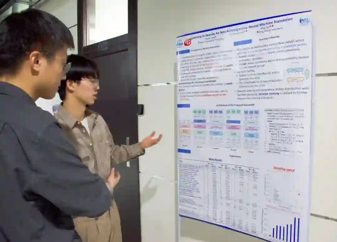 此次Poster交流大会从15:45开始到17:00结束,参展的9篇Poster涉及对话、机器翻译、情感分析等多个领域。其间实验室全体师生在科创大厦展览区就参展Poster进行了热烈的讨论,在交流和创新中充实完善了自己的知识体系。