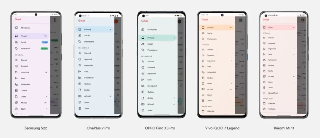 Material You,特别是动态配色,将很快在全球范围内搭载 Android 12 的更多手机上提供支持,包括 Samsung、OnePlus、Oppo、Vivo、realme、小米、Tecno 等等!
