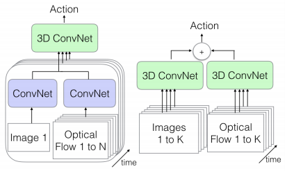 (2) 我们还可以在一个流 (数据的空间信息) 中传递单个图像帧,并从视频 (数据的时间信息) 中传递其相应的光流表示。我们将使用常规的 2D CNNs 从两者中提取特征,然后将它们组合起来传递给我们的 3D CNN,它将组合这两种类型的信息