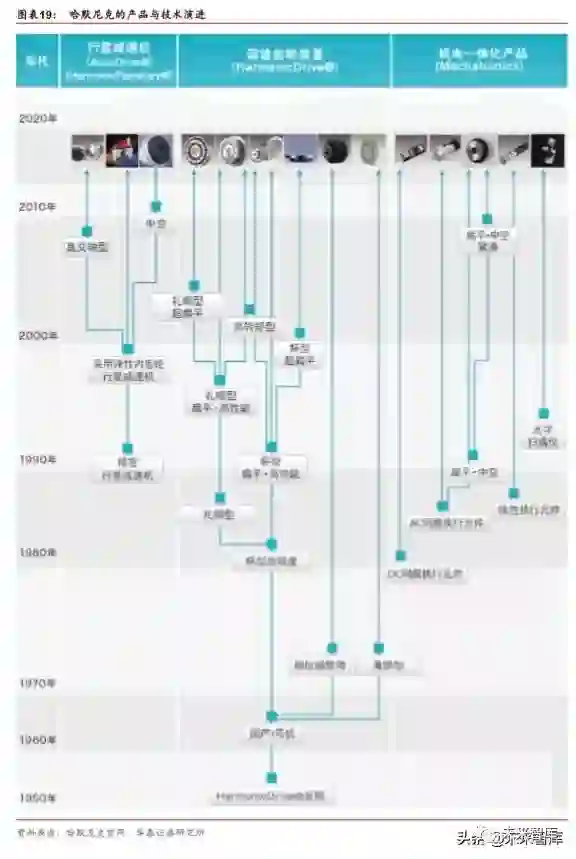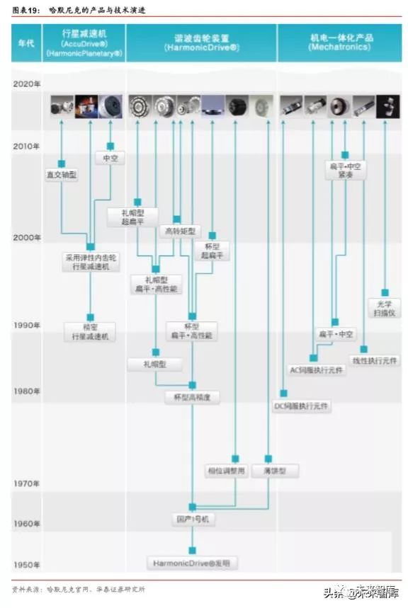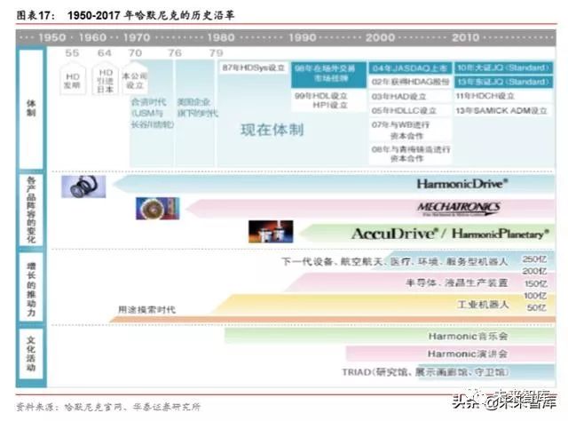 1970 年,日本长谷川齿轮有限公司与美国 USM 公司合资设立了 Harmonic Drive Systems Inc.,开始销售谐波齿轮装置,主要用于机器人与机床的连接和驱动装置。公司的 HarmonicDrive®具备小型、轻量、高精度等特点,可广泛用于汽车、数字设备、半导体 晶片、平板显示器生产工序中的产业用机器人关节部分,在全球市场中获得了较高份额。此外,在人型机器人、测量试验装置、人工卫星、石油采掘装置等更大的用途领域,公司 也提供其他机构难以实现的差异化附加值产品。