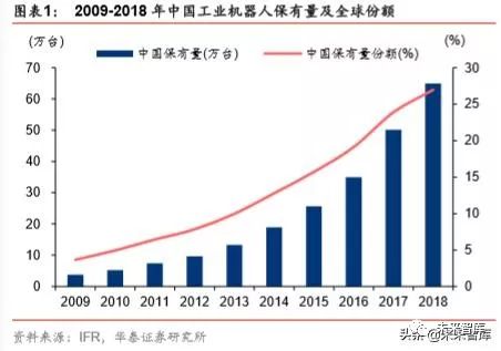 2009-2018 年中国工业机器人保有量在全球保有量的占比稳步提升。据 IFR 数据,截止 2018 年底,中国工业机器人保有量达到 64.94 万台,全球占比为 26.97%。2013-2018 年 间中国新增工业机器人中国产品牌的占比约在 20%-30%之间。中国逐步成为工业机器人 的主要需求国,同时中国的工业机器人企业也在这一产业背景下逐步发展壮大。