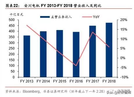 工业机器人及运动控制业务收入占比接近,是公司两大核心业务。2018 财年公司工业机 器人实现收入2054.2亿日元/yoy-4.54%,收入下滑主要系下游手机等消费电子需求疲软, 收入占比为 37.5%,运动控制业务实现收入 1780 亿日元/+6.71%,收入占比达 43.28%。