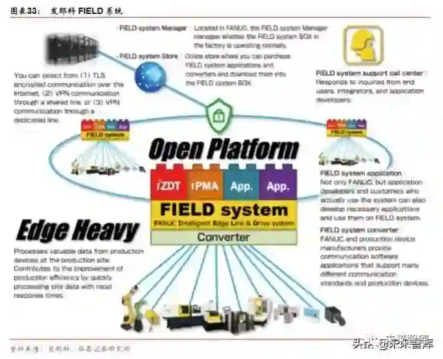FIELD 系统:发那科的工业物联网方案。发那科于 2016 年推出 FIELD 系统,可将发那科 产品和其他工厂内设备联网,同时提供一套开源平台,客户可根据自身需求进行定制化开 发。Bloomberg 数据显示,截止 2019 财年,发那科已在自有的 15 座工厂中安装 19 套 FIELD 系统,约 923 台设备已联网。目前 FIELD 系统的外部使用者均为日本公司,包括 THK、NSK 和 Keyence。