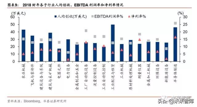 传统装备制造业的人均创收更高。人均创收主要用于衡量企业的经营效率,对设备制造企 业而言,人均创收指标的高低与自动化程度正相关,与劳动密集度负相关。2018 年人均 创收排名靠前的行业为工业配送与租赁、半导体制造、建筑与采矿机械、农业机械、飞机 与零部件,除半导体制造以外,均为产业发展较为成熟的传统装备制造业。