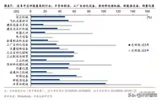以 3-5 年的时间跨度看,半导体制造、工厂自动化设备等新兴产业的总回报居前列。选取 总 回 报 ( 资 本 收 益 加 股 息 ) 数 据 作 为 衡 量标准, 在 全 球 制 造 业 中,近 3 年 (2016/06/30~2019/06/30,下同)总回报最高的细分行业分别为半导体制造(102%)、 环保设备(62%)、工业自动化控制(59%)、工业配送与租赁(59%)、原材料处理机械 (53%)。近 5 年(2014/06/30~2019/06/30,下同)总回报最高的行业为半导体制造(151%)、 工厂自动化设备(117%)、原材料处理机械(111%)、新能源设备(105%)、测量仪器(85%)。