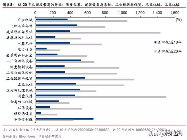 从更长的时间跨度来看,近 10 年(2009/06/30~2019/06/30,下同)总回报最高的行业为 半导体制造(662%)、工业配送与租赁(564%)、工厂自动化设备(518%)、原材料处理 机械(509%)、飞机与零部件(476%)。