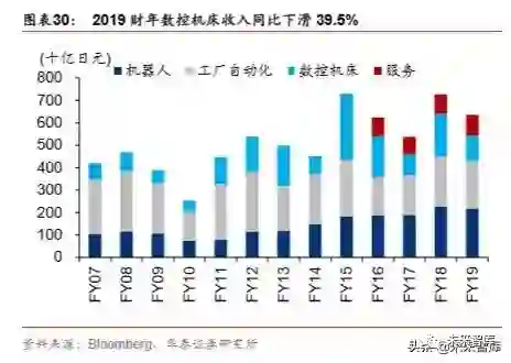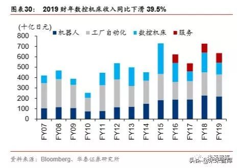 数控机床大幅下滑拖累整体收入。2019 财年(截至 2019 年 3 月 31 日),发那科实现营 业收入 6,356 亿日元/yoy-12.53%。其中,机器人与工厂自动化两大业务收入同比分别下 滑 4.52%和 5.02%,数 控机床收入大幅下滑 39.5%,主要受到机械设备产量减缓和中美汽 车制造商投资延后的影响。
