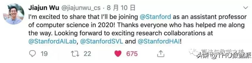 吴佳俊说:“很高兴告诉大家,我将于2020年加入斯坦福大学担任计算机科学助理教授!感谢一路上帮助我的每一个人。期待接下来与斯坦福AI实验室、斯坦福视觉学习实验室以及斯坦福以人为本AI研究院激动人心的研究合作!”
