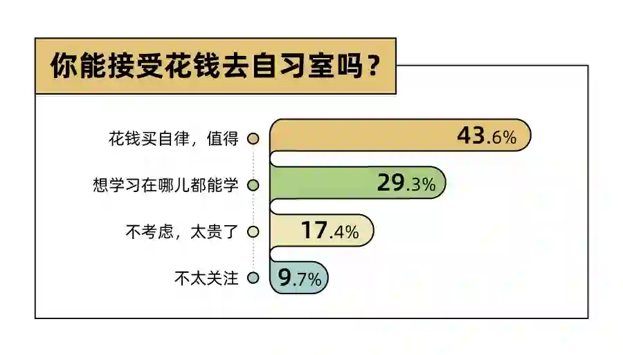 为了探究年轻人是否愿意花钱去自习室,36氪·后浪小数据发起了调查,共有598位年轻人参与投票。其中,4成以上的年轻人坚信“花钱买自律”是值得的;近2成的年轻人被价格劝退,果断抛弃付费自习室。