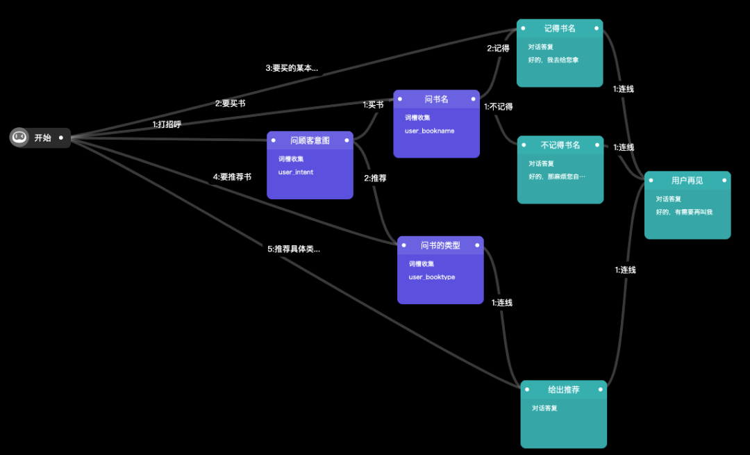 用户SAYHI,系统询问意图是买书还是推荐,用户回答若是买书则同2,若是推荐则同4;