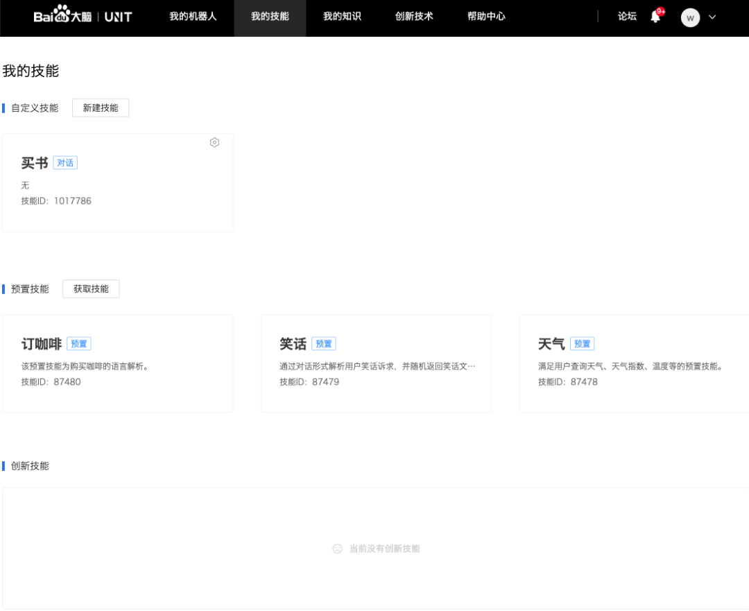 第二层是技能,技能用来完成某个特定的功能。一个机器人可以绑定多个技能。“我的技能”界面如下图所示,可以看出系统预置了一些技能,这些技能一方面可以作为DEMO让用户更快地熟悉这个系统;另一方面可以让用户直接使用,从而更方便地构建出有趣的机器人。点击新建技能,可以发现UNIT把自定义技能分为两种类型:问答型和对话型。其实在NLP圈,这里所谓对话型技能更专业的名字应该叫“任务导向型(task-oriented)问答”,我们今天要体验的就是对话型技能。