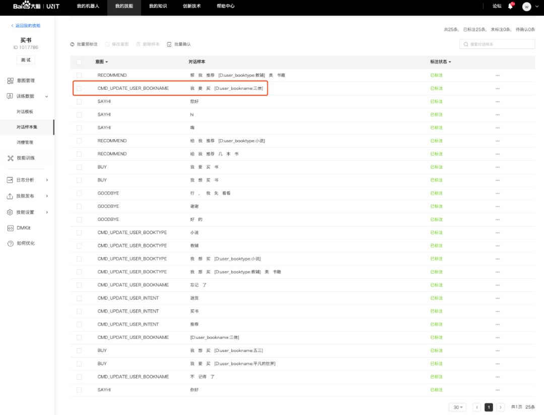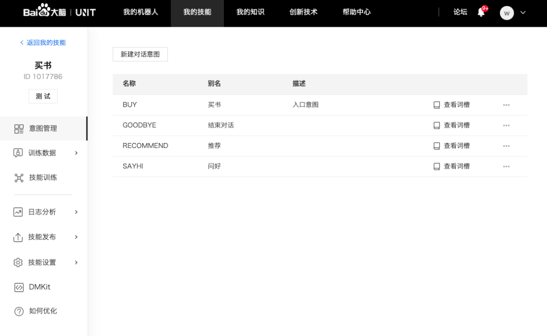 在每个UNIT的对话型技能里,用户可以定义多个意图(intent)。下图是技能编辑的默认界面,管理的就是意图。我个人是比较赞同这种建模逻辑的,要建立一个有效的机器人,必须首先对用户在特定对话空间内表达的意图有完整的把握。