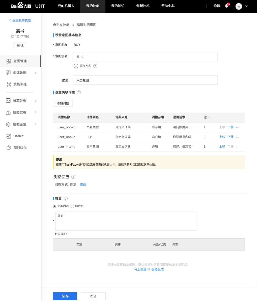 下图是意图编辑界面。在每个意图里,你需要定义它的基本信息、关联词槽和对话回应。