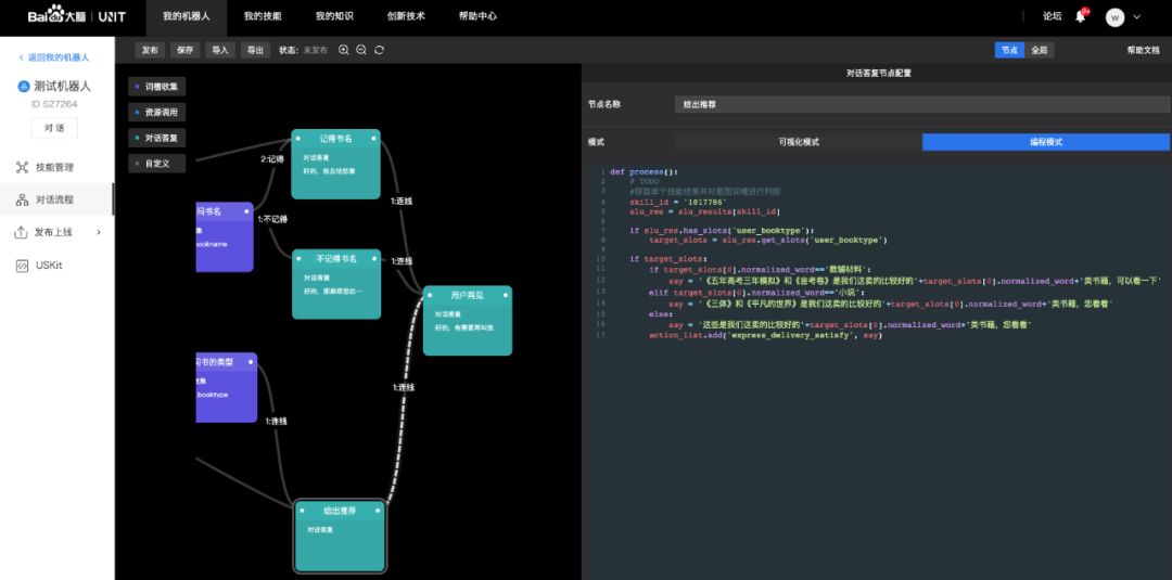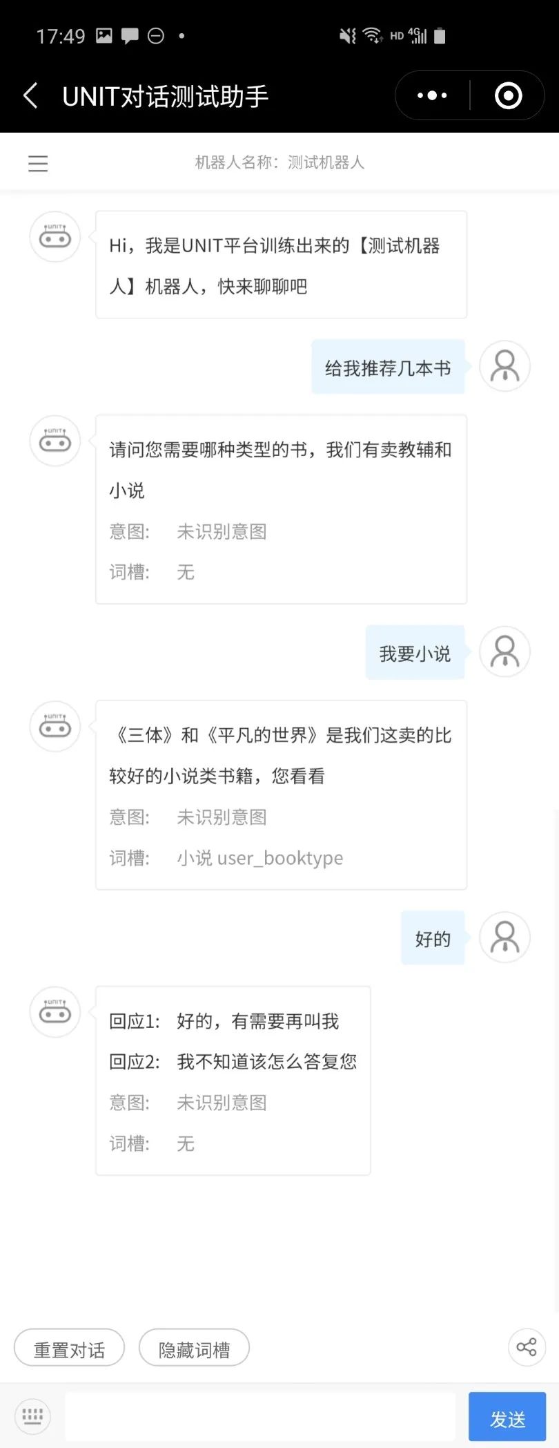 下面是两个失败的案例。左边的例子期望能像最后一个成功案例一样直接进入推荐书节点,但可能是被那个“你好”给干扰了;右边的例子则表面UNIT的slot filling只能识别出词典中已经被定义的词。严格意义上这也不算失败,只是一种策略选择。