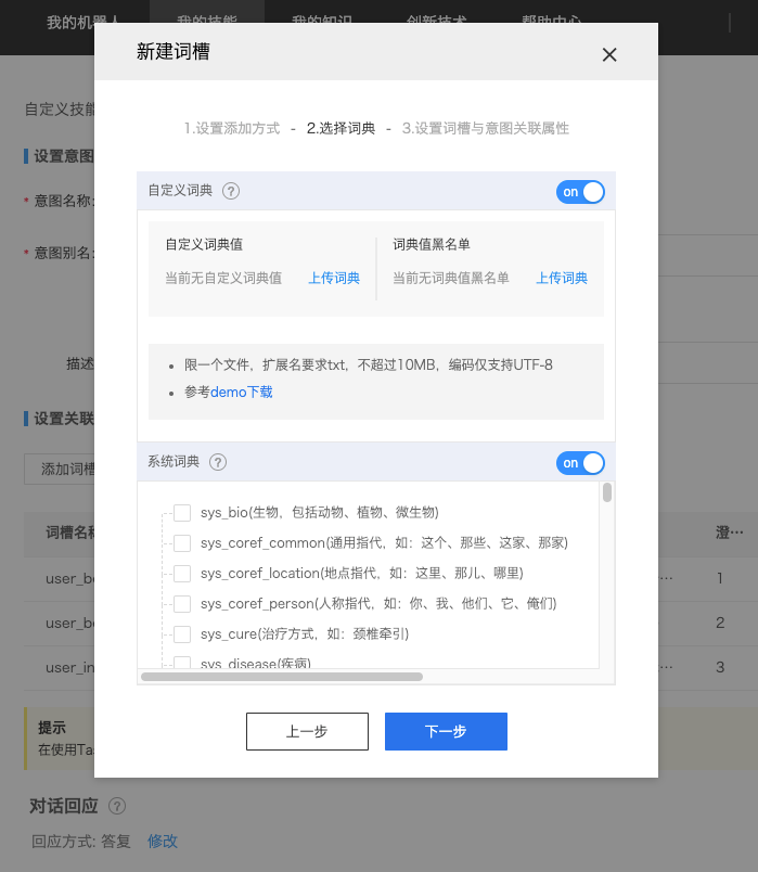 定义词槽的时候除了名称、别名等常规项外,需要给出一个词槽词典,词典中列举该词槽中可能出现的值,词典定义支持指定同义词近义词。这个词典除了可以由用户提供外,还可以选择系统的内置词典。从下图可以看出,系统词典是相当丰富的,除了名词,还包含了代词,百度在NLP领域的基本功在此可见一斑。为了防止误识别,还可以给出一个黑名单,在黑名单里的词不会识别为该词槽。
