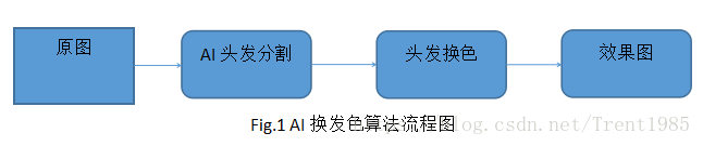 给照片或者视频中的人物头发换颜色,这个技术已经在手机app诸如天天P图,美图秀秀等应用中使用,并获得了不少用户的青睐。如何给照片或者视频中的人物头发换发色?换发色算法流程如下图所示: