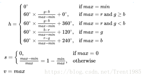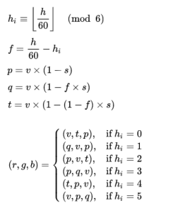 我们以RGB和HSV颜色空间为例,首先来看下HSV和RGB之间的转换公式: