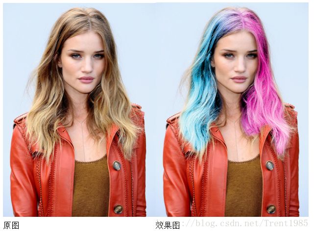 大家可以看到,针对上面这张原图,头发比较黑,在HSV颜色空间进行头发换色之后,效果图中很不明显,只有轻微的颜色变化;