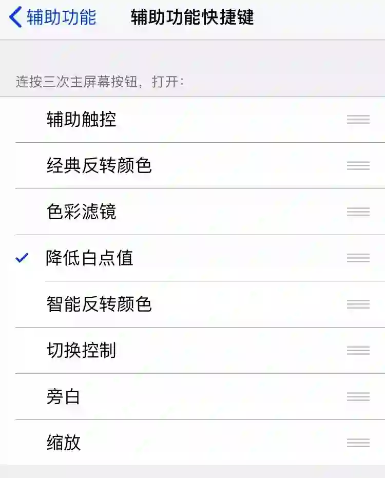 前往设备的「设置 - 通用 - 辅助功能 - 辅助功能快捷键」,勾选「降低白点值」。
