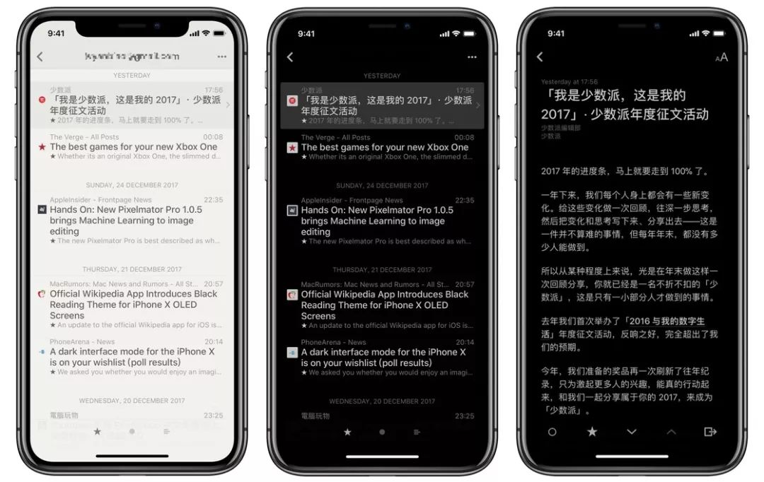 而随着搭载 OLED 屏幕的 iPhone X 面世,也有越来越多的 iOS 应用更上「黑暗模式」的潮流,其中不乏 Reeder、Flipboard 这些优秀的阅读应用。