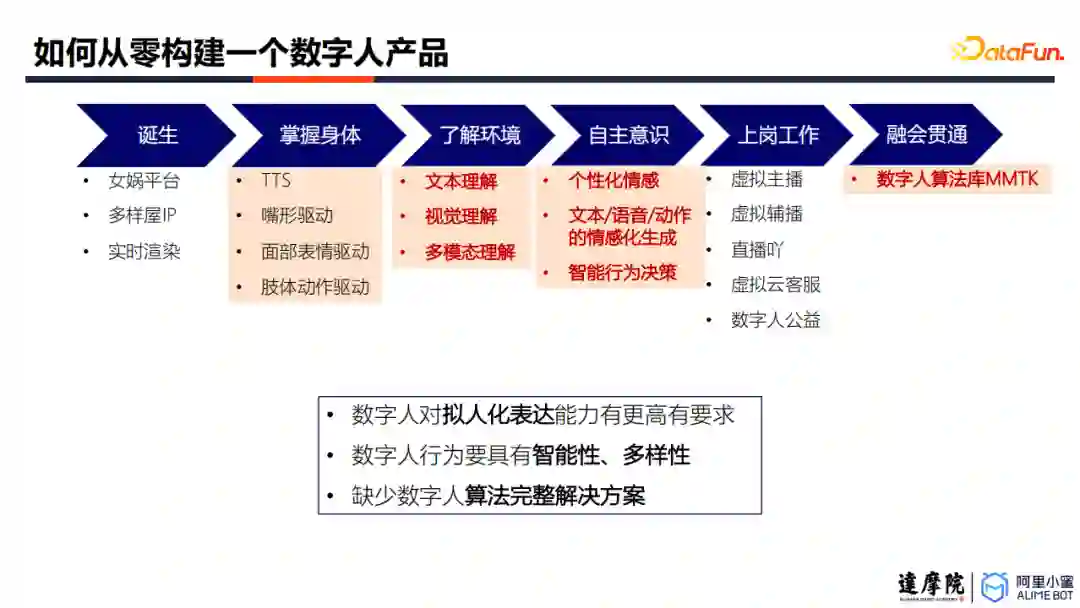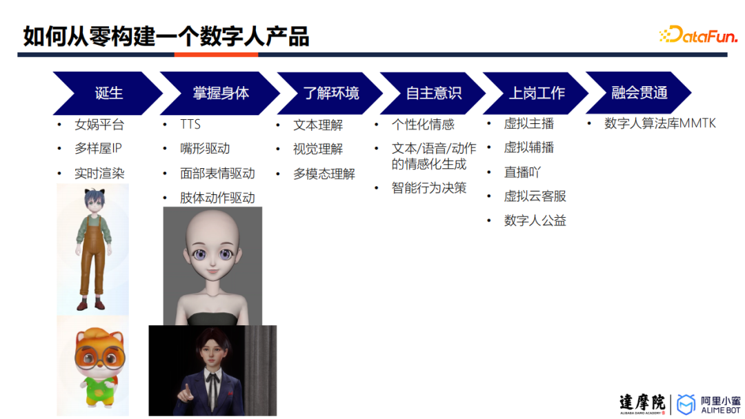 接着,从数字人诞生、模型驱动、环境感知与理解、自主行为驱动、落地场景、基础算法库等方面,介绍了阿里数字人从零开始的构建过程;