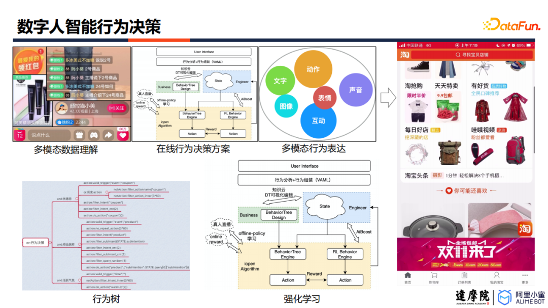 在数字人场景中,会有多个数字人同时出现(元宇宙),或者一个数字人需要响应多个用户(互动直播)。因此,数字人需要拥有行为决策能力,根据其环境决定其后续行为。数字人小蜜团队提出专家行为决策+强化学习的解决方案。首先,基于行为树构建数字人的初始行为能力;后续,利用强化学习技术,设计不同的reward来调节数字人行为,使得在线上运行一段时间之后,各个数字人会拥有差异性的决策逻辑。