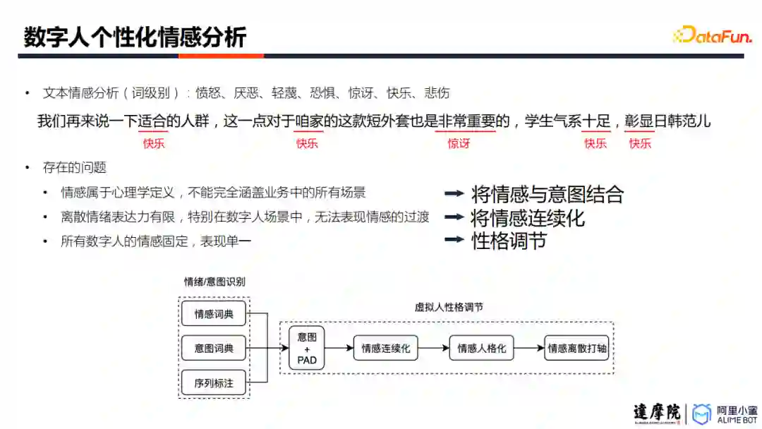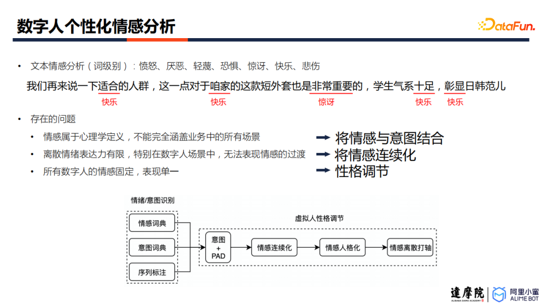 第三部分介绍了个性化情感分析方法、以及在此基础上的文本/声音/动作增强方案,以提升数字人的表现力;