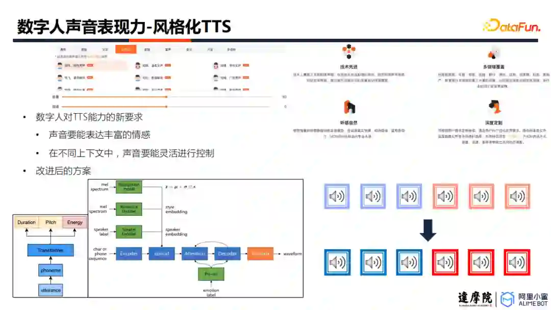 内容有了之后,我们希望数字人使用具有高表现力的声音,将内容表达出来,以实现更加丰富的情感表达。为了实现更加丰富的韵律控制,需要对原有的TTS方案进行改进。数字人小蜜团队引入了五个控制参数,包括pitch、energy、duration、speaker embedding以及emotion label。改进之后,合成的语音会有更加丰富的语音表现力。