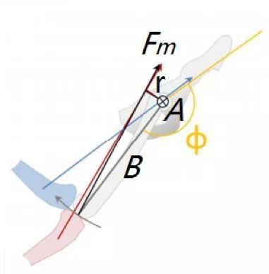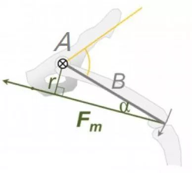 线段B代表大腿股骨,圆圈A是旋转中心(髋关节),Fm表示大腿后侧肌群的用力方向,r是力臂的长度。图片来源:参考文献 [2]
