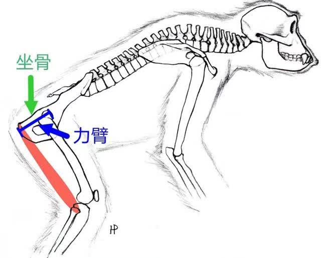 大腿后侧肌群在髋关节上的那一端固定坐骨上,因此坐骨越长,“扳手”系统的力臂就越长,攀爬时下肢运动的过程也就越省力。非人灵长类的坐骨普遍朝向身体后方,在它们跳跃落地时就可以轻松不费劲。