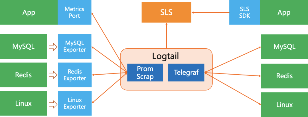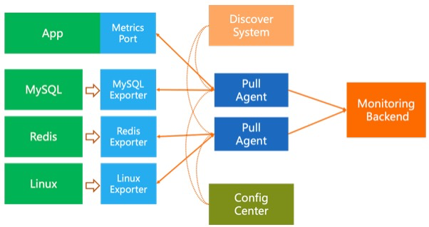 1. Agent统一代理,抓取主机、MySQL等中间件数据推送到监控系统;Agent也可以作为转发器接收应用推送 2. 应用主动推送到监控系统  |